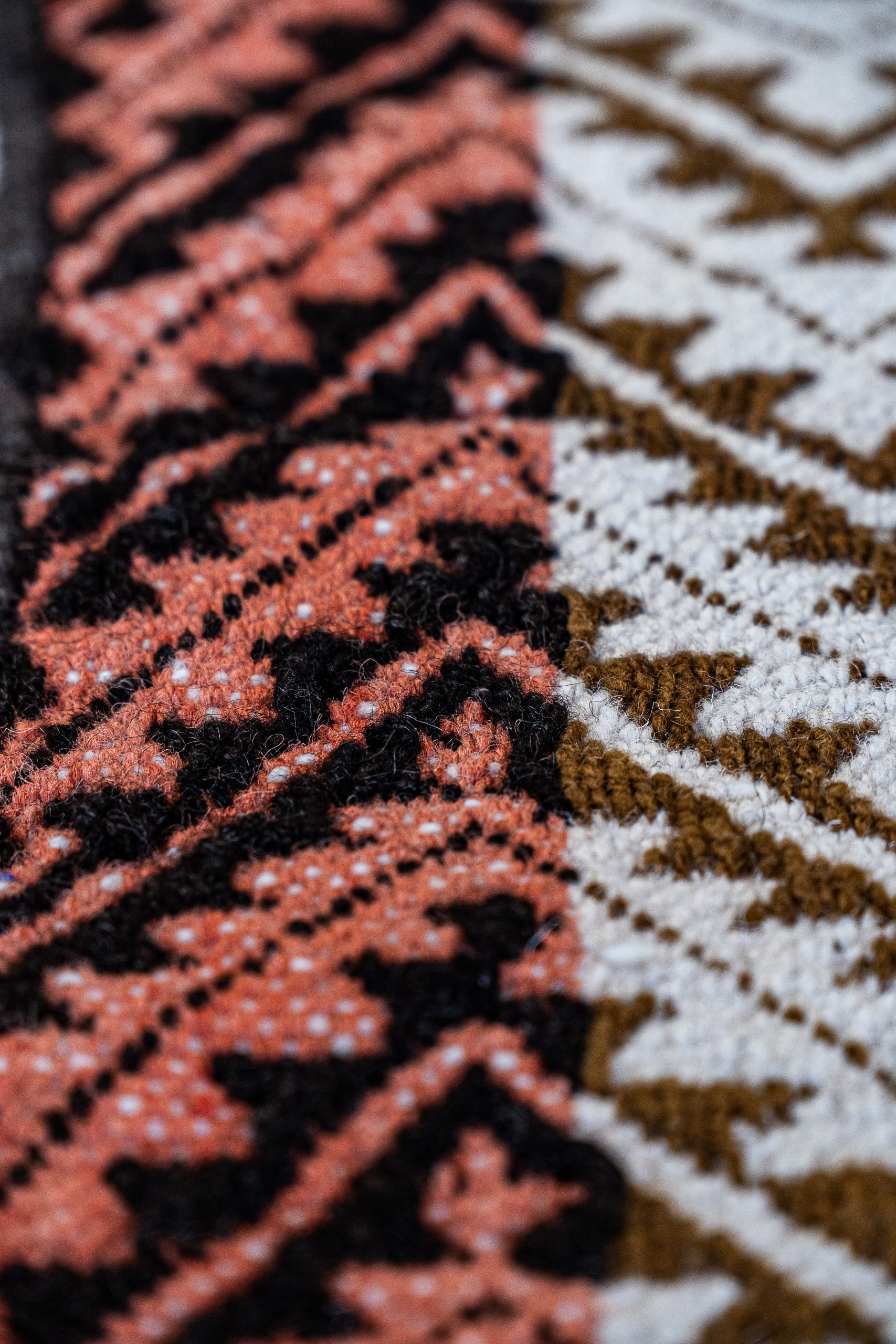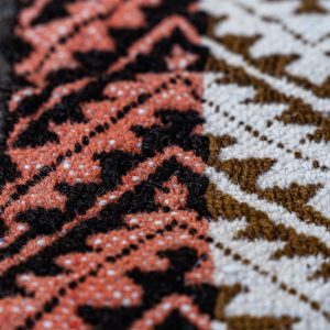 También tejido en telar vertical mapuche con lana de oveja de hilado medio, esta pieza conserva los tonos naturales de la fibra. Su diseño presenta la labor “wangulen”, una representación de las estrellas que evoca a los astros y su vínculo con un espíritu femenino protector. Una obra de gran complejidad técnica y simbólica.